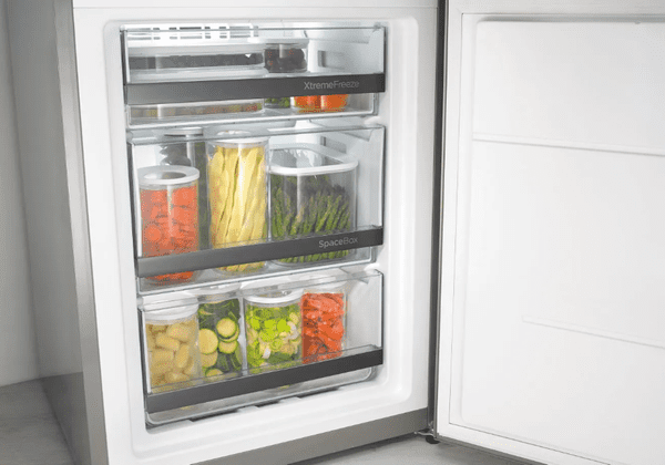 Mraziaca časť pracuje s technológiou NoFrost Plus, takže vnútro zostáva bez námrazy a údržba je minimálna. Funkcia FastFreeze (-24 °C) rýchlo zmrazí čerstvé potraviny a zachová ich kvalitu. Tri prehľadné zásuvky uľahčujú organizáciu, pričom spotrebič dosahuje mraziaci výkon 7 kg/24 h a pri výpadku elektriny udrží potraviny bezpečne až 15 hodín.