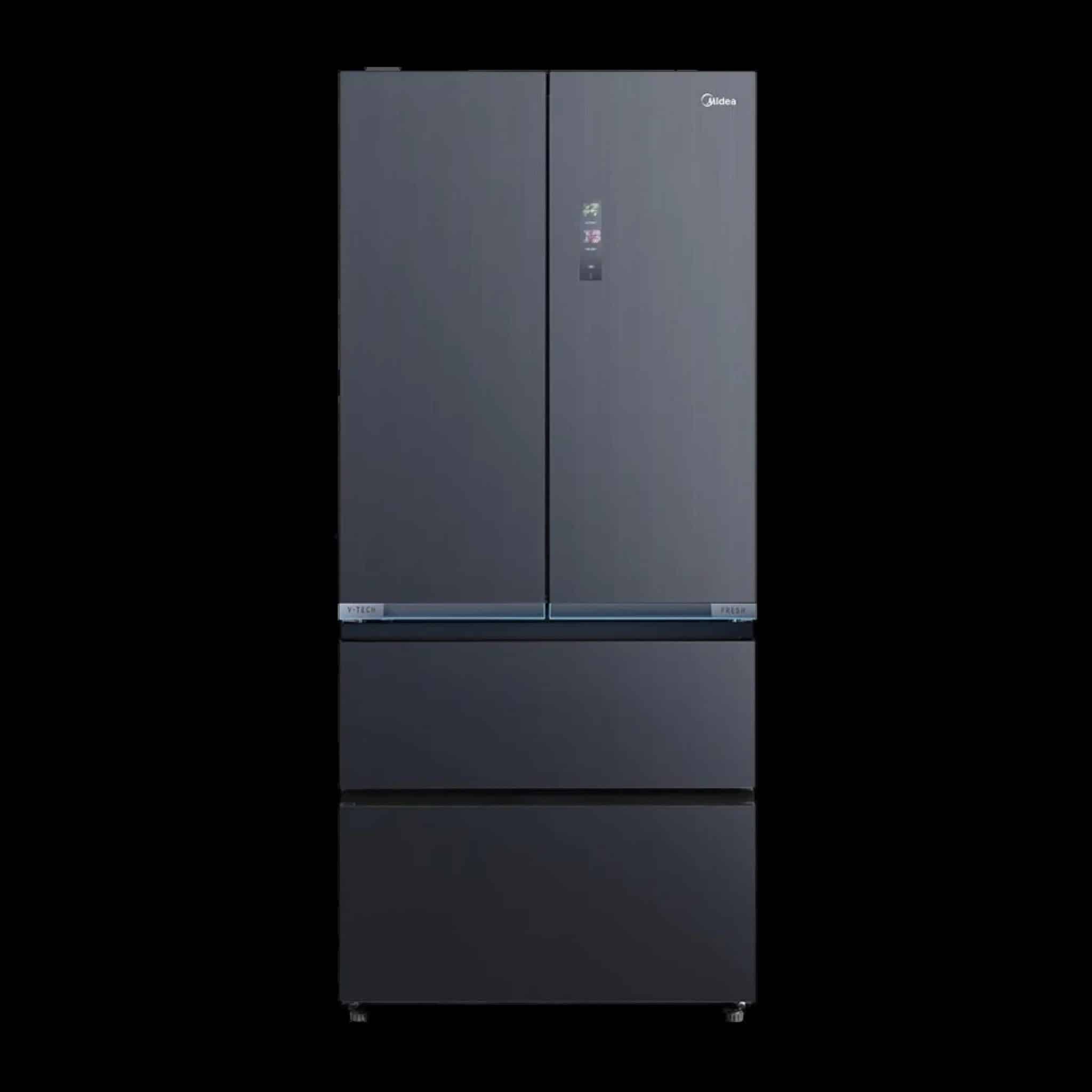 Pohľad spredu na zatvorenú chladničku Midea MDRF705BIE70 s tmavými sklenenými dverami a displejom