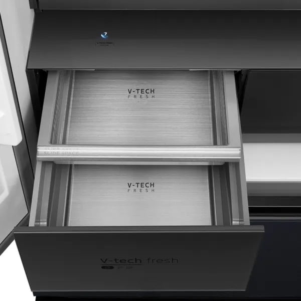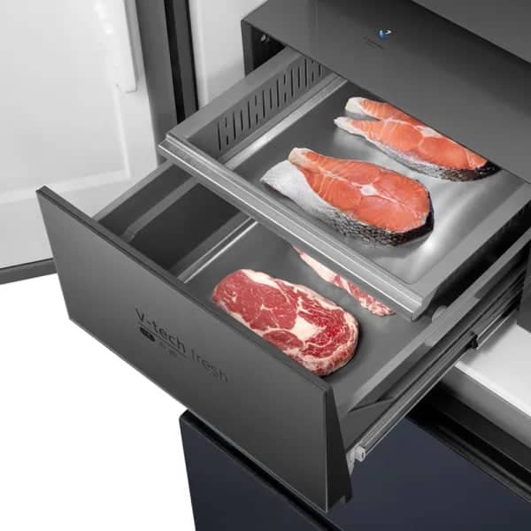 Špeciálna zásuvka V‑tech Soft Freeze je určená na jemné mrazenie, aby si mäso a ryby zachovali kvalitu až 7 dní bez hlbokého mrazenia. Hygienu podporuje IPL Purify s intenzívnym pulzným svetlom a aktívna filtrácia PST+, ktorá odstraňuje zápach už za 9 minút a priebežne čistí vzduch v chladničke.