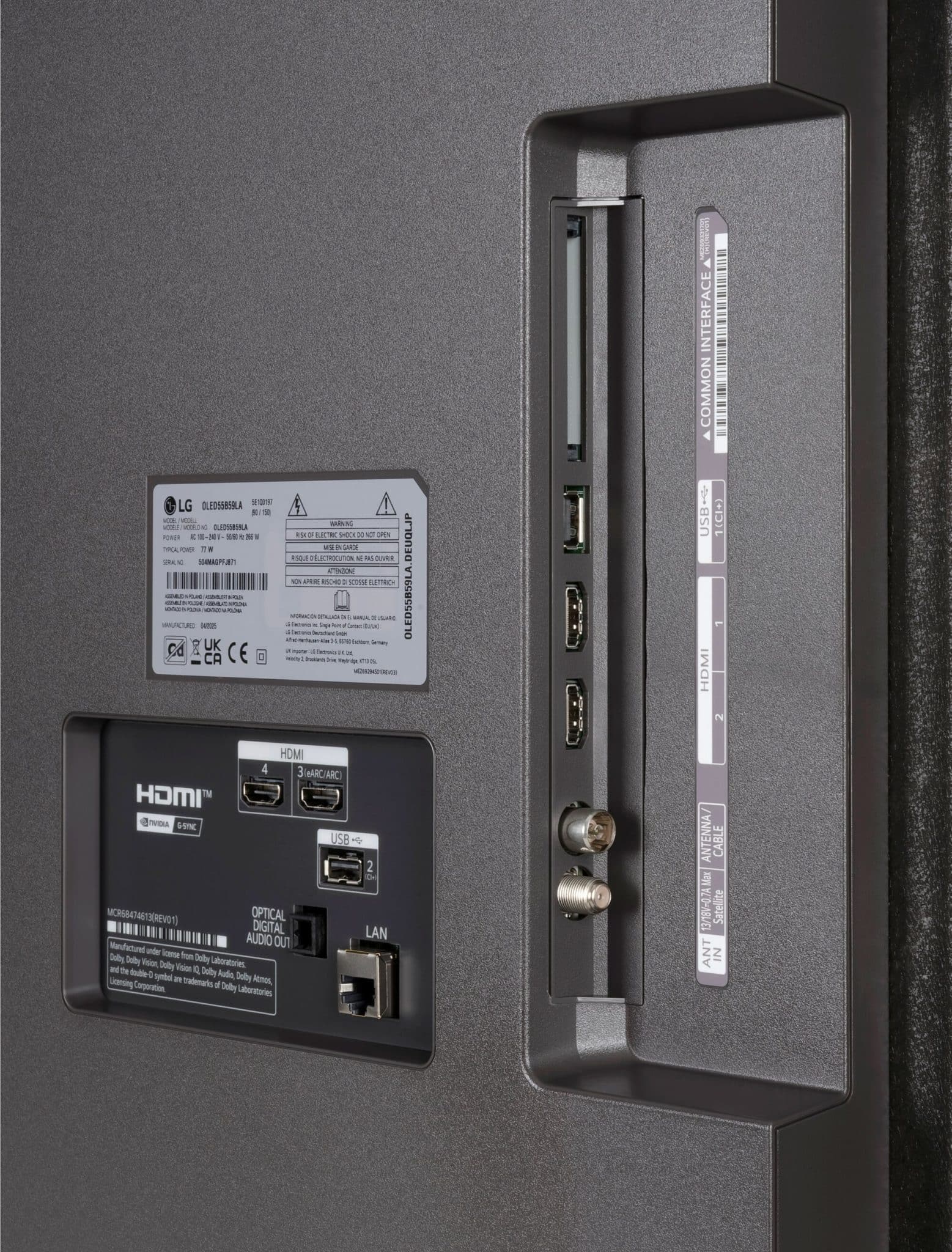 Pre pripojenie zdrojov obrazu a zvuku sú k dispozícii 4× HDMI s podporou eARC, 2× USB 2.0, LAN (RJ‑45) a optický audio výstup. Televízor si rozumie s DVB‑T2, DVB‑C a DVB‑S2 (CI+ slot), takže je pripravený na pozemný, káblový aj satelitný príjem. Podporované sú aj kodeky H.264/H.265 (HEVC) pre moderné 4K vysielanie a obsah.